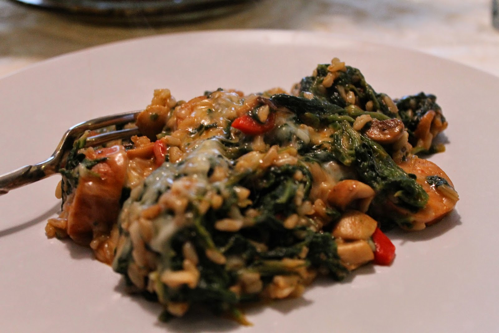 The beauty of this recipe is, it can be modified. use Turkey links instead of Chicken, Change the spinach for Zucchini, Change the spices or the cheese. If you are feeding more than 3 or 4 people, add more sausage, vegetables or rice. Live people -- move outside of the box...